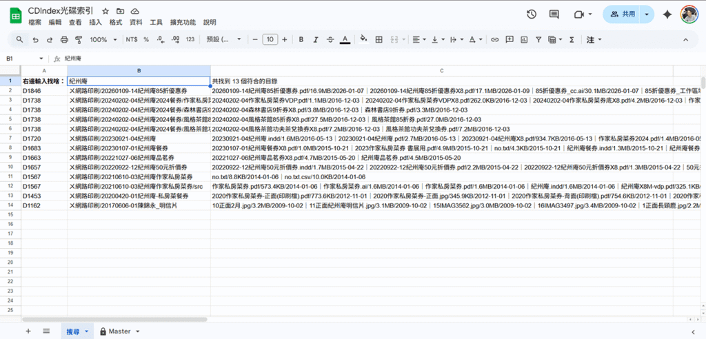 • A2 進階版之搜尋公式=IFERROR(FILTER(Master!A2:C, REGEXMATCH(Master!B2:B, “(?i)”&B1)), “找不到符合的檔案”)